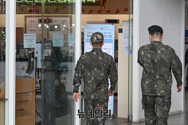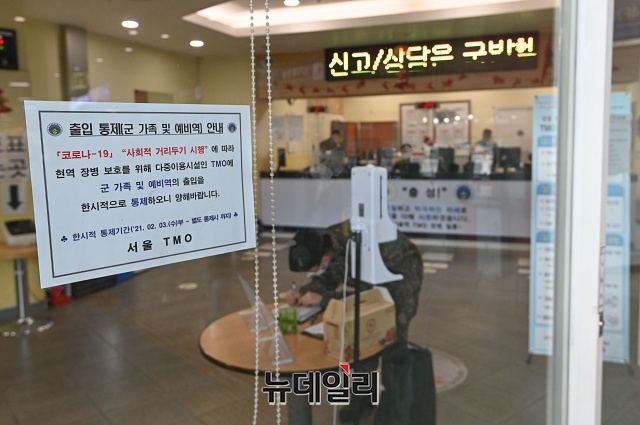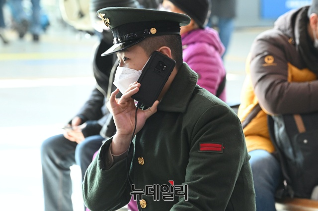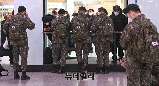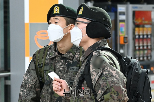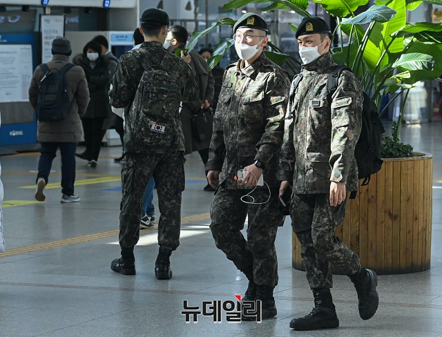 사회적 거리두기 2.5단계가 시행중인 2일 오후 서울 중구 서울역에서 장병들이 기차표를 끊고 있다.국방부는 작년 추석(10.1) 이전 입대자 등 입대 후 한 번도 휴가를 못 간 신병에 한해 3일부터 휴가를 허용한다고 밝혔다. 코로나 방역을 위해 휴가복귀 후 2주간 격리 및 코로나 검사를 실시하고, 신병 휴가 복귀일도 통제할 예정이다.국방부는 정부의 사회적 거리두기 단계 연장에 따라 현재 적용 중인 군내 거리두기 2.5단계를 14일까지 2주간 연장한다.