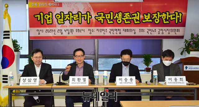 이날 세미나에는 성삼영 국민노조 정치교육원장, 최환열 공정시장위원장, 이승용 경총 고용정책팀장, 이웅희 한양대 경영전문대학원 교수가 참석했다.