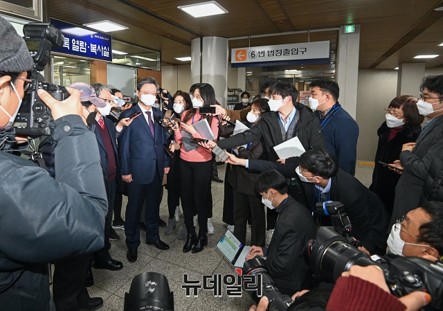 우병우 전 청와대 민정수석이 4일 오후 서울 서초구 서울고등법원에서 열린 항소심 결심공판을 마치고 취재진의 질문에 답하고 있다.