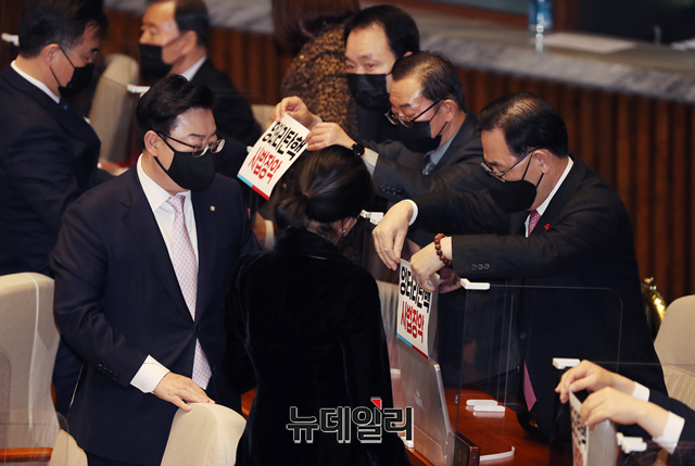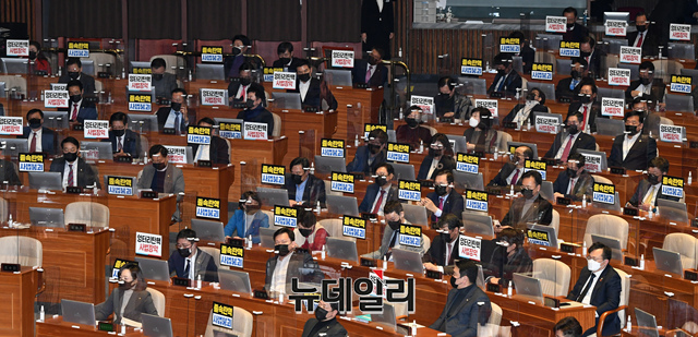 국민의힘 의원들이 4일 오후 국회본회의에서 임성근 부장판사에 대한 탄핵소추안 표결에 반대하는 피켓을 기림막에 붙이고 있다. (사진=공동취재단)