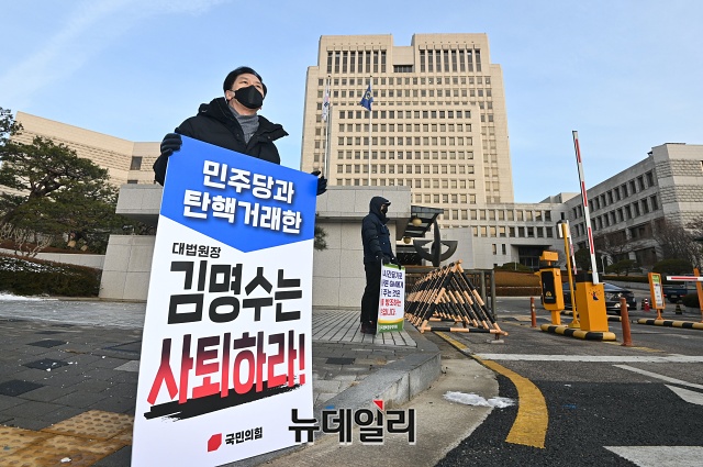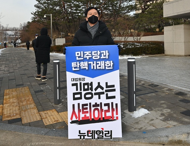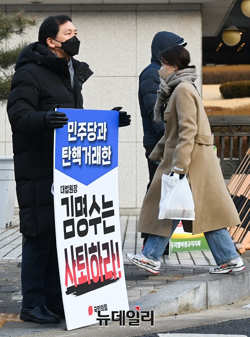 김기현 국민의힘 의원이 5일 오전 서울 서초구 대법원 앞에서 김명수 대법원장 사퇴를 촉구하는 1인 시위를 하고 있다.국민의힘은 국회 사상 처음으로 법관 탄핵소추안이 가결되자 '탄핵거래 진상조사단'을 발족한다고 밝혔다. 진상조사단은 김기현 의원을 비롯해 김도읍·장제원·유상범·김웅·전주혜 의원 등 총 6명이 활동한다.김 의원은 4일 국회 본회의에 회부된 임성근 법관 탄핵소추안 관련 의사진행에서 "김 대법원장은 임성근 판사가 사표를 냈는데도 내지 않았다고 거짓말을 한 것이 들통났다"라며 "결국 임 판사를 국회 탄핵소추에 희생제물로 넘겨주기로 탄핵거래를 한 것이라는 논란에 휩싸였다"고 말했다.