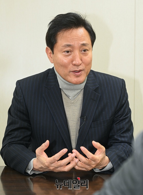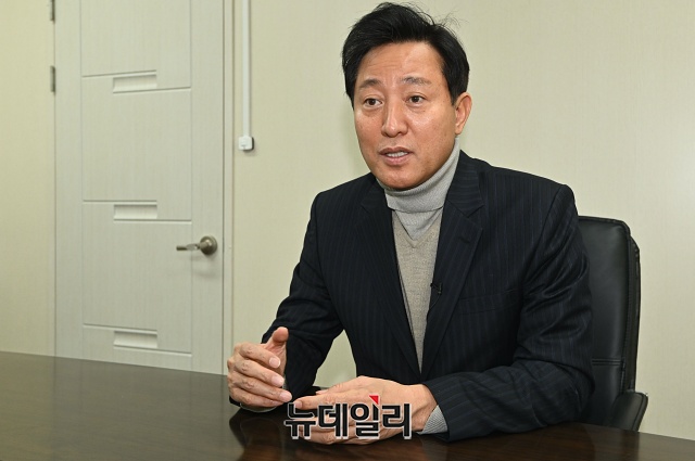 오세훈 국민의힘 서울시장 예비후보가 4일 오전 서울 광진구 선거캠프 사무실에서 뉴데일리와 인터뷰를 갖고 있다.