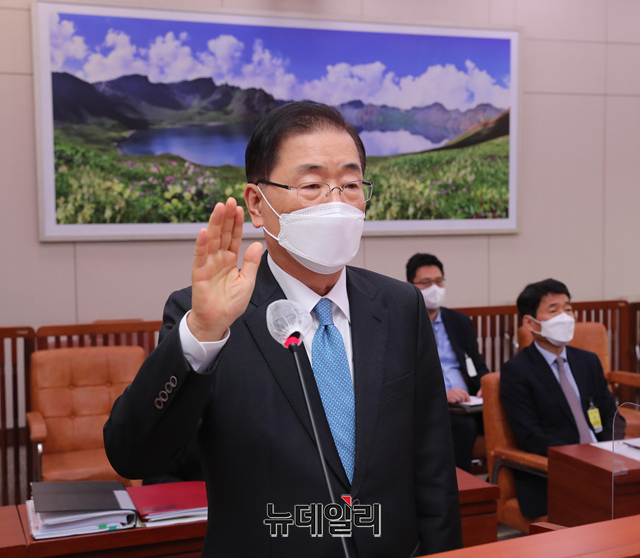 정의용 외교부 장관 후보자가 5일 오전 국회에서 열린 인사청문회에서 선서를 하고 있다. (사진=공동취재단)