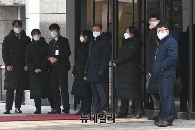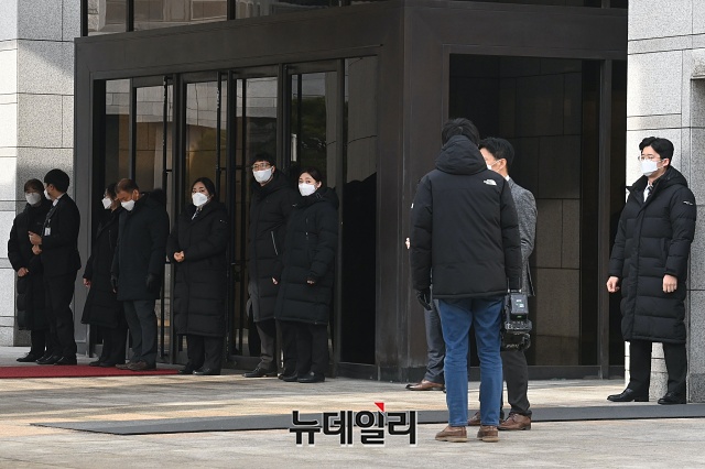 대법원 보안요원들이 5일 오전 서울 서초구 대법원 앞에서 국민의힘 탄핵거래 진상조사단 소속 의원들의 정식절차 없는 출입을 막기 위해 문 앞에서 대기하고 있다.