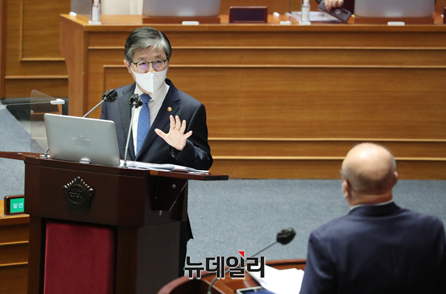 변창흠 국토교통부 장관이 5일 오후 국회에서 열린 본회의 대정부질문에서 의원들의 질문에 답하고 있다. (사진=공동취재단)