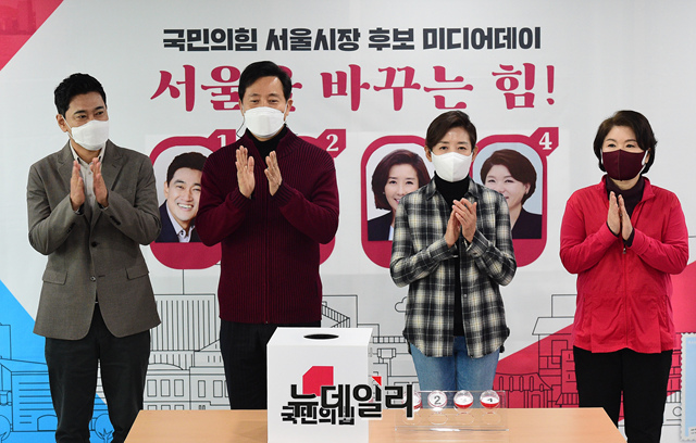 국민의힘 서울시장 후보 예비경선을 통과한 오신환·오세훈·나경원·조은희 후보가 8일 오전 서울 여의도 국민의힘 중앙당사에서 서울시장 선거 본경선 미디어데이에서 경선 후보자 기호 추첨을 하고 있다. (사진=공동취재단)