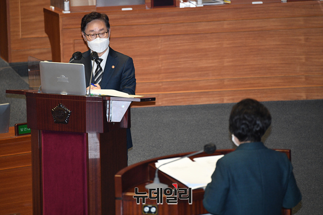 박범계 법무부 장관이 8일 오후 국회에서 열린 교육·사회·문화에 관한 대정부질문에서 의원들의 질문에 답하고 있다. (사진=공동취재단)
