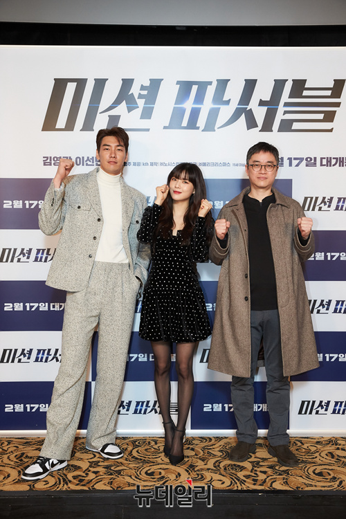 배우 김영광(왼쪽부터), 이선빈, 김형주 감독이 8일 오전 서울 광진구 롯데시네마 건대입구에서 열린 영화 '미션 파서블(감독 김형주)' 언론배급시사회에서 포토타임을 갖고 있다.