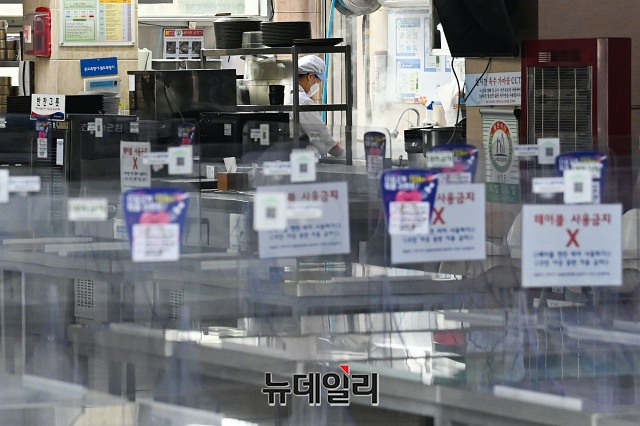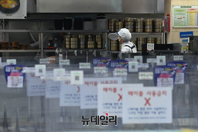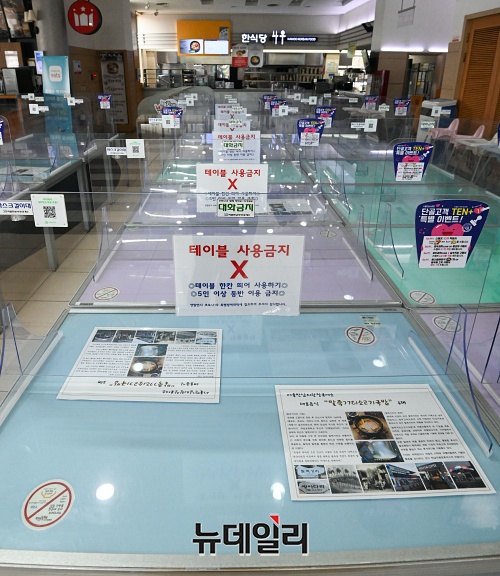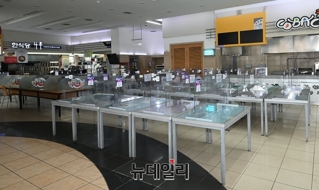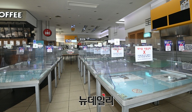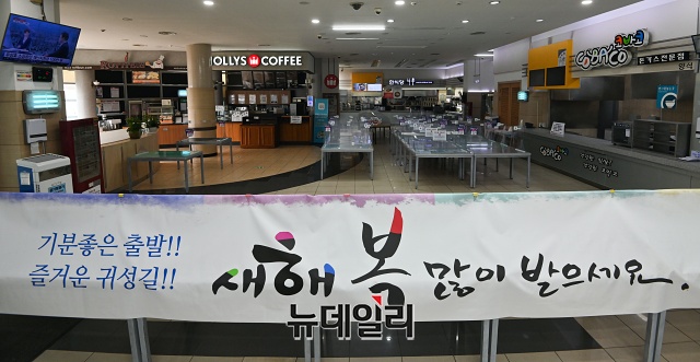 설 연휴를 앞둔 10일 오후 서울 서초구 만남의광장 휴게소에 실내취식 금지로 테이블이 한쪽으로 정리되어 있다.