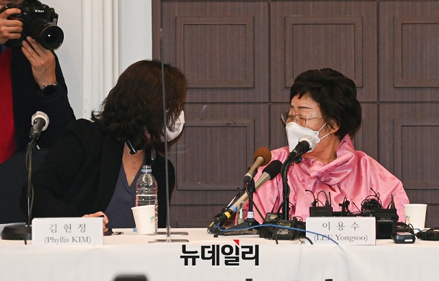 일본군 위안부 피해자 이용수 할머니가 16일 오전 서울 중구 프레스센터에서 열린 '일본군 위안부 문제 유엔국제사법재판소 회부 촉구 기자회견'에 참석하고 있다.