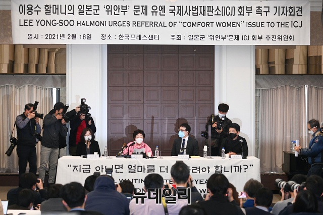 일본군 위안부 피해자 이용수 할머니가 16일 오전 서울 중구 프레스센터에서 열린 '일본군 위안부 문제 유엔국제사법재판소 회부 촉구 기자회견'에서 발언하고 있다.