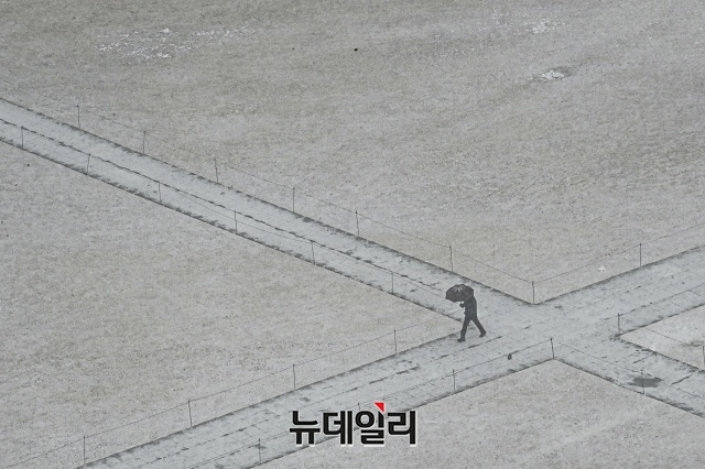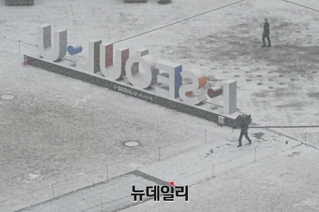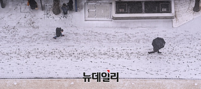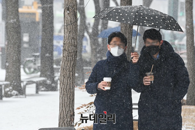 서울을 비롯한 수도권에 한파주의보가 내려진 16일 오후 서울 종로구 광화문역 인근에서 시민들이 눈을 피하기 위해 우산을 쓰며 이동하고 있다.