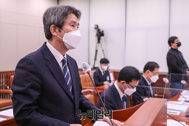 이인영 통일부 장관이 18일 오후 국회에서 열린 외교통일위원회 전체회의에 출석해 발언을 하고 있다. (사진=공동취재단)