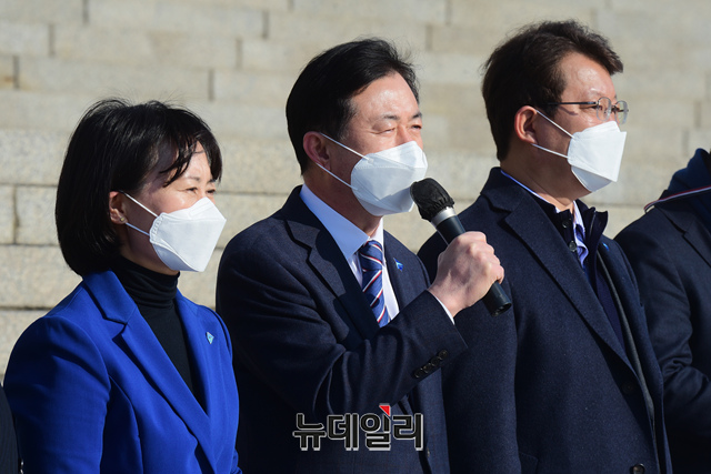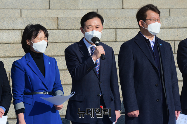 김영춘 더불어민주당 부산시장 예비후보가 19일 오전 국회 본청 앞에서 열린 '가덕도신공항 특별법 통과를 위한 더불어민주당 부산광역시장 예비후보 합동기자회견'에서 발언을 하고 있다.