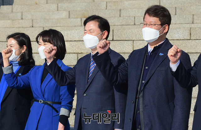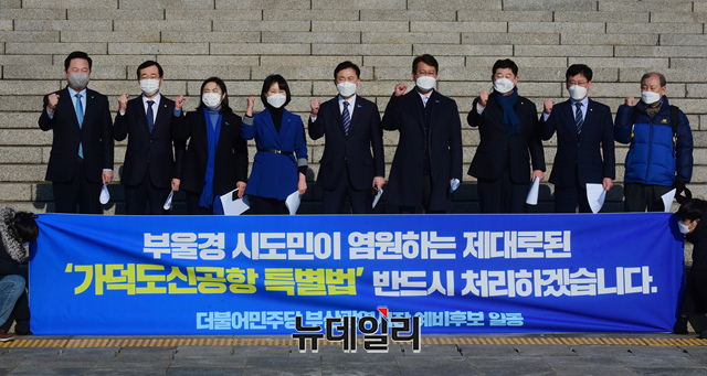 김영춘·박인영·변성완 더불어민주당 부산시장 예비후보가 19일 오전 국회 본청 앞에서 열린 '가덕도신공항 특별법 통과를 위한 더불어민주당 부산광역시장 예비후보 합동기자회견'에서 구호를 외치고 있다.