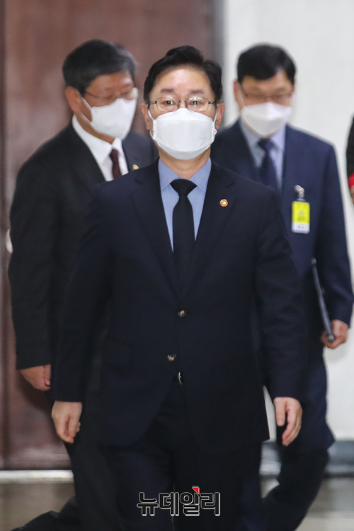 박범계 법무부 장관이 22일 오전 국회에서 열린 법제사법위원회 전체회의에 참석하기위해 이동하고 있다. (사진=공동취재단)