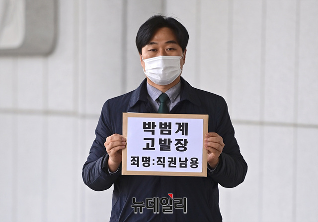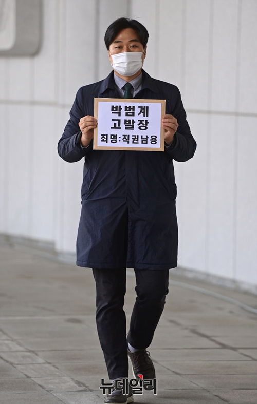 이종배 법치주의바로세우기행동연대 대표가 22일 오전 서울 서초구 대검찰청으로 박범계 법무부 장관을 직권남용 혐의로 고발장을 제출하기 위해 입장하고 있다.이 대표는 기자회견문을 통해 "박 장관이 검찰 고위 간부 인사에 대해 문재인 대통령의 정식 결재를 받지 않은 상태에서 인사를 발표했다"며 "박 장관이 위법·부당하게 권한을 남용하고, 대통령 인사권을 침해했다"고 주장했다.