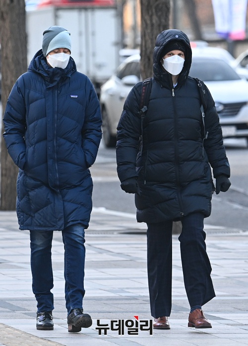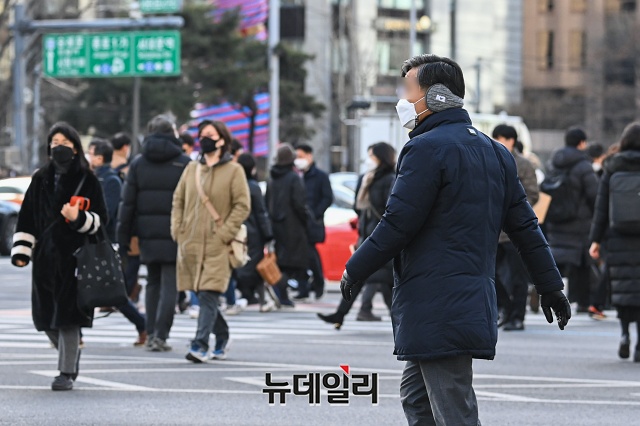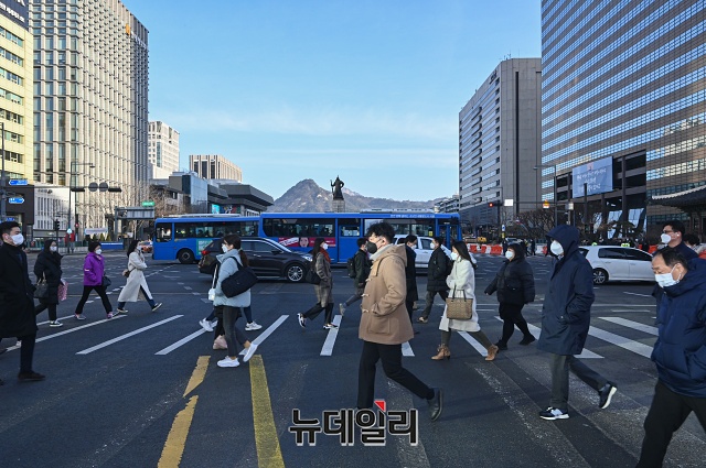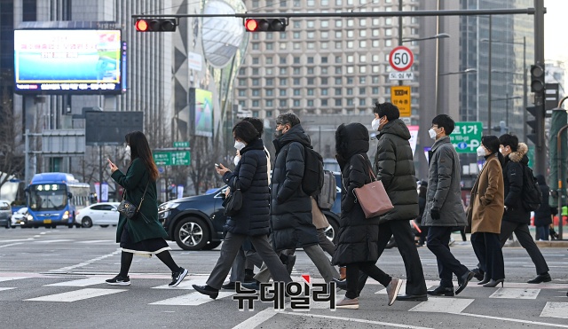 서울과 경기 등 수도권에 한파주의보가 발효된 23일 오전 서울 종로구 광화문광장에서 직장인들이 패딩을 입고 출근하고 있다.