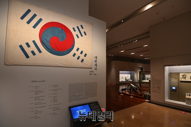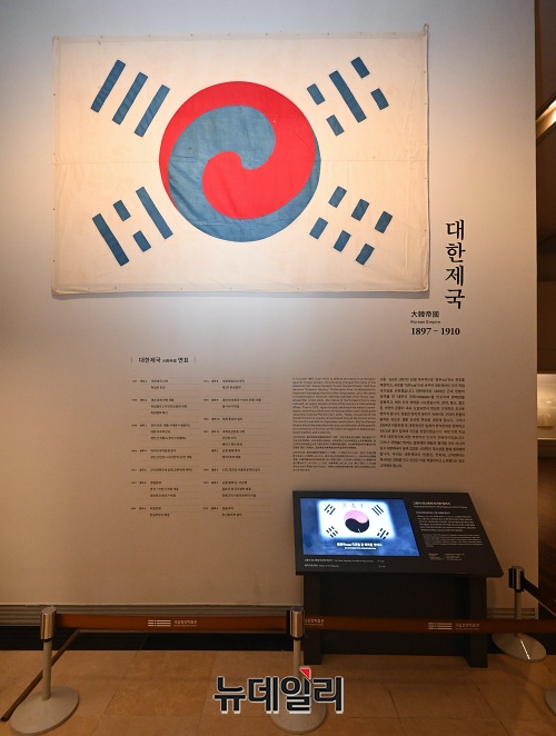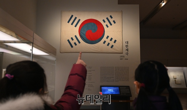 서울 용산구 국립중앙박물관을 찾은 어린이들이 23일 오전 '데니태극기'를 관람하고 있다.국립중앙박물관은 제102주년 삼일절을 맞아 23일부터 2주간 국내에서 가장 오래된 태극기인 '데니 태극기’를 공개한다고 밝혔다.이 태극기는 고종이 외교고문이였던 오언 데니가 미국으로 돌아갈 때 하사했다. 흰색 광목 두 폭을 이은 천에 붉은색과 푸른색 천을 오려서 바느질한 태극을 달았다. 4괘의 형태와 배치는 지금 태극기와 같지만 색은 검은색이 아니라 푸른색이다.