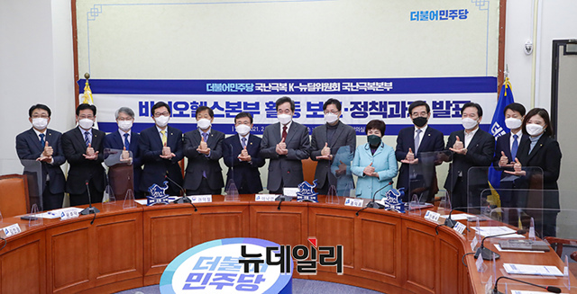 이낙연 더불어민주당 당대표가 24일 오전 국회에서 열린 국난극복K-뉴딜위원회 바이오헬스본부 결과발표회에 참석하여 기념촬영을 하고 있다. (사잔=더불어민주당)