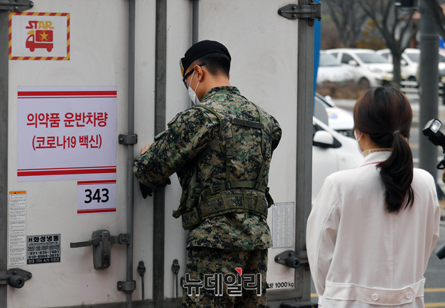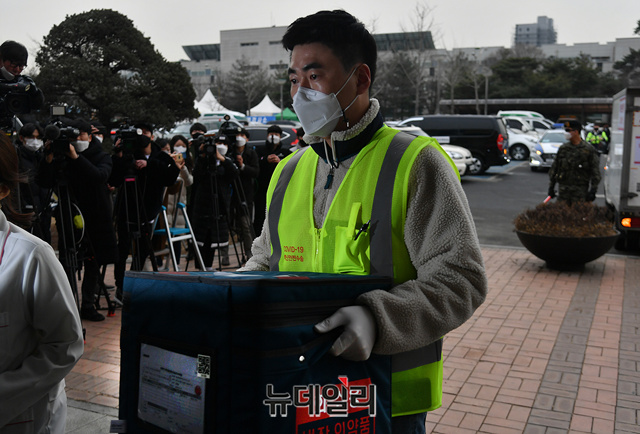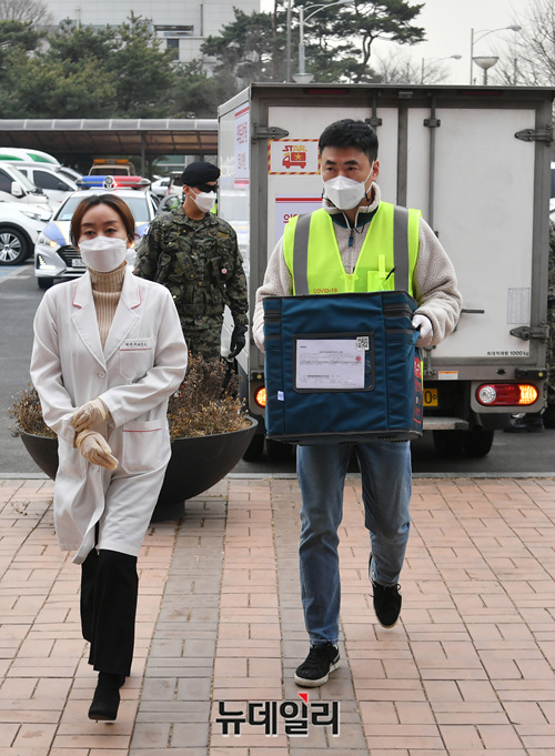 경기 수원시 권선구 보건소에 25일 오전 아스트라제네카(AZ) 코로나19 백신을 실은 운송 트럭이 도착해 관계자가 백신 수송함을 이송하고 있다.