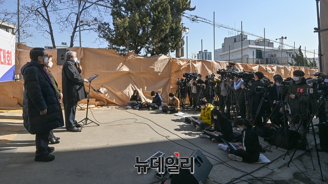 전광훈 사랑제일교회 담임목사가 26일 오전 서울 성북구 사랑제일교회에서 열린 '3.1절 문재인 탄핵 국민대회 기자회견'에서 발언하고 있다.