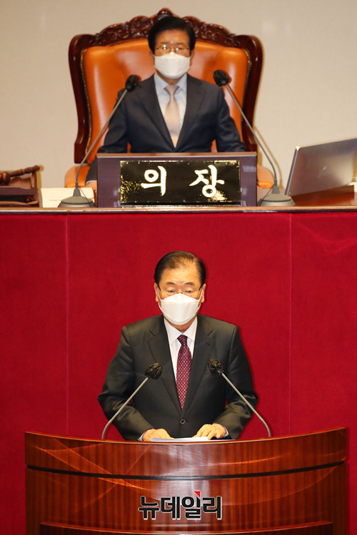정의용 외교부 장관이 26일 오후 국회에서 열린 본회의에 참석해 신임 국무위원 인사말을 하고 있다. (사진=공동취재단)