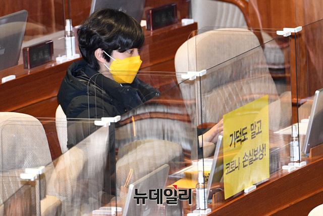 류호정 정의당 의원이 26일 오후 국회에서 열린 본회의에서 '가덕도 말고 코로나 손실보상!' 피켓을 붙이고 있다. (사진=공동취재단)