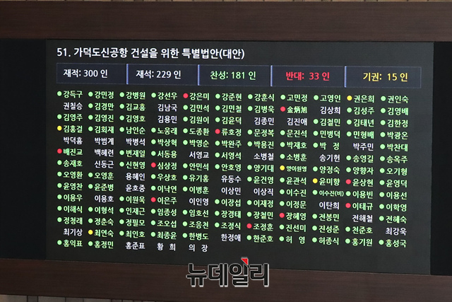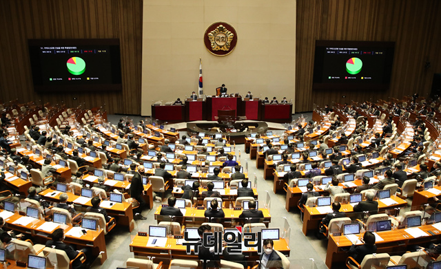 가덕도신공항 건설을 위한 특별법안이 26일 오후 국회에서 열린 본회의에서 통과되고 있다. (사진=공동취재단)