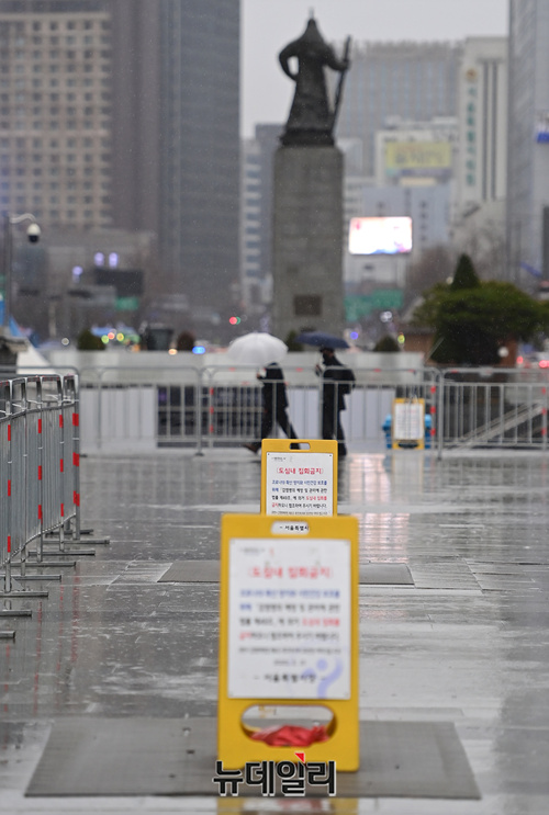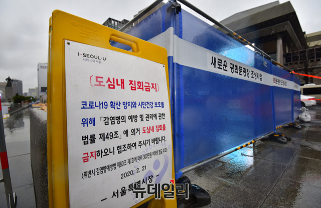 [포토] 광화문 광장에 설치된 '도심내 집합금지' 안내판