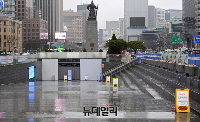 제102회 삼일절인 1일 오후 서울 광화문 광장에 '도심내 집회금지'를 알리는 안내판이 설치돼 있다. 이날 서울도심에는 오전부터 문재인 정권을 규탄하는 기자회견과 차량집회가 곳곳에서 진행됐다.