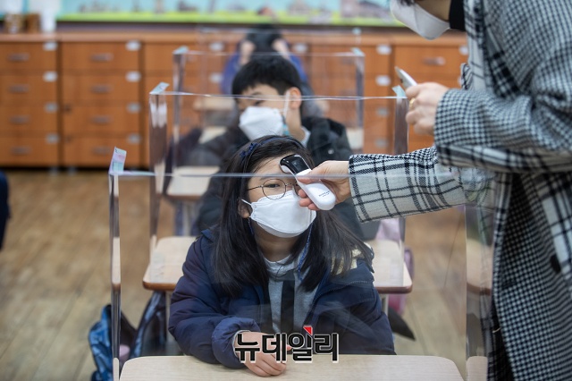 2021학년도 첫 등교를 시작한 2일 오전 서울 강남구 서울포이초등학교에서 초등학생들이 손소독을 하고 있다.