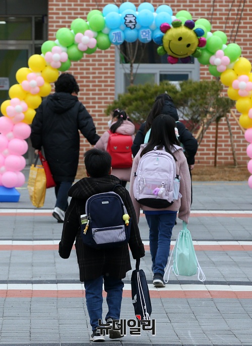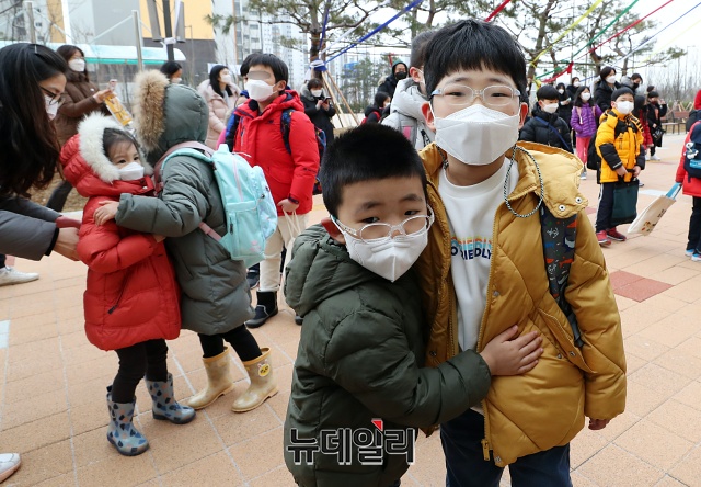 전국적으로 개학이 시작된 2일 오전 서울 강동구 강빛초중이음학교에서 초등학생들이 등교하고 있다.