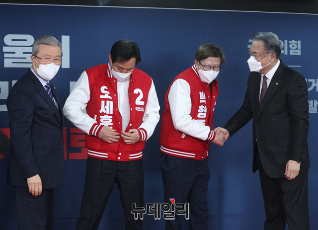 김종인 국민의힘 비상대책위원장이 4일 오전 서울 여의도 국민의힘 중앙당사에서 열린 서울·부산시장 후보 경선 결과 발표회에서 오세훈 서울시장 후보와 박형준 부산시장 후보와 기념촬영을 하고 있다. (사진=공동취재단)