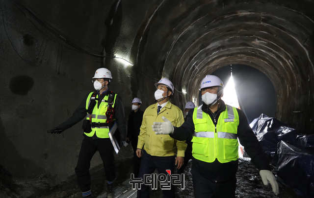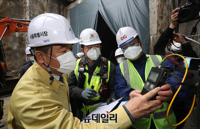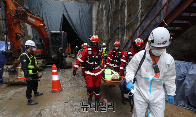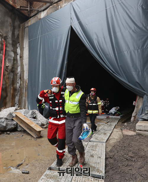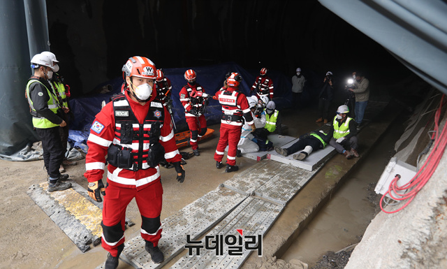 서울시장 권한대행을 비롯한 관계자들이 4일 오전 해빙기를 대비해 반포천 유역분리터널 건설 현장에서 터널 공사장 흙막이 붕괴 상황을 가장한 모의 훈련을 실시하고 있다.