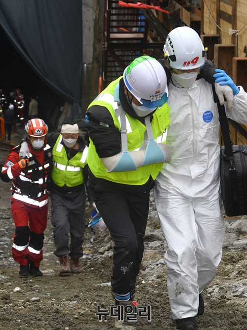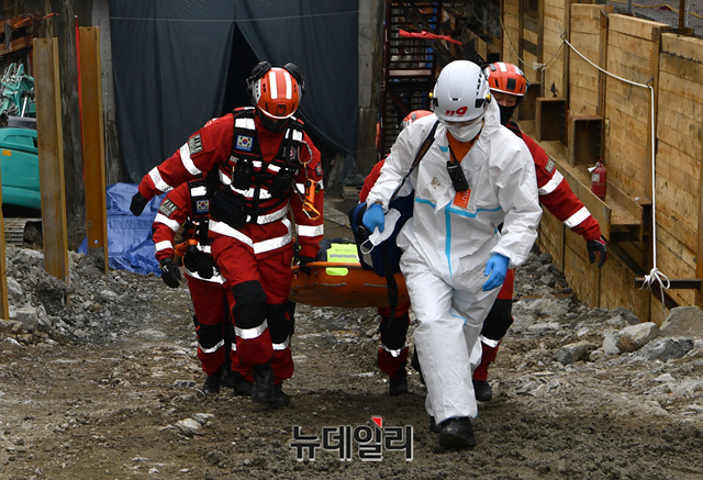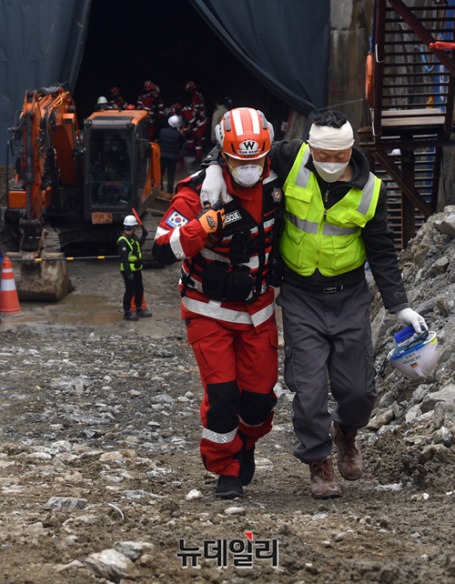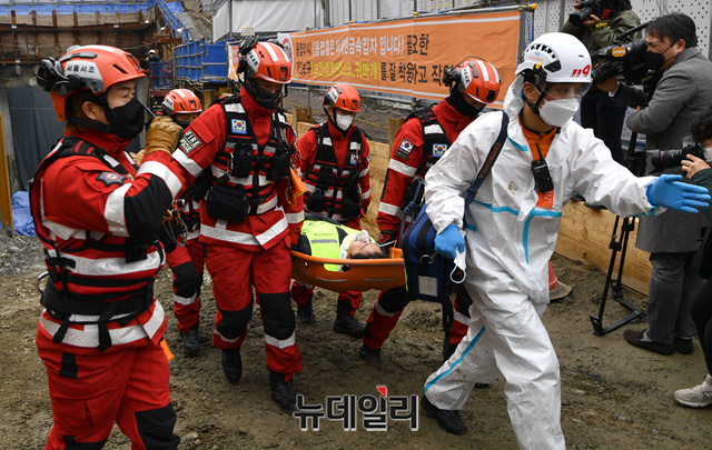 서울시 관계자들이 4일 오전 해빙기를 대비해 반포천 유역분리터널 건설 현장에서 터널 공사장 흙막이 붕괴 상황을 가장한 모의 훈련을 실시하고 있다.