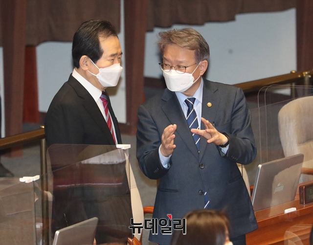 정세균 총리가 5일 오전 국회에서 열린 본회의에서 추가경정예산 관련 시정연설에 앞서 권칠승 중소벤처기업부 장관과 대화를 나누고 있다. (사진=공동취재단)