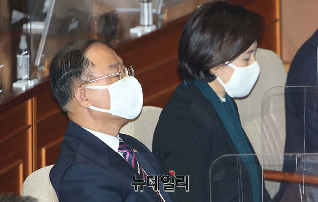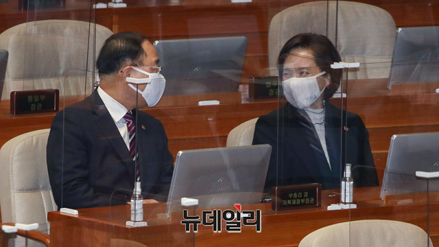 홍남기 부총리 겸 기획재정부 장관과 유은혜 부총리 겸 교육부 장관이 5일 오전 국회에서 열린 본회의에서 대화를 나누고 있다. (사진=공동취재단)