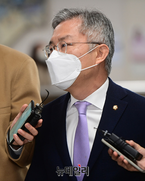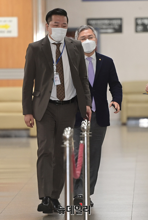 공직선거법을 위반 혐의로 재판에 넘겨진 최강욱 열린민주당 대표가 5일 오전 서울 서초구 서울지방법원에서 열린 첫 공판에 출석하고 있다. 최 대 표는 지난 4.15총선 후보자 때 "조국 전 장관의 아들이 실제 인턴을 했다" 취지의 발언으로 기소됐다.
