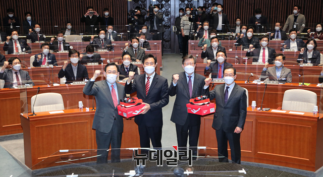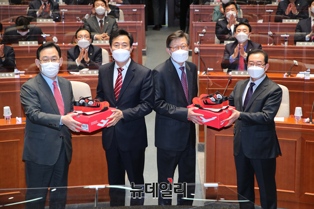 오세훈 국민의힘 서울시장 후보와 박형준 부산시장 후보가 5일 오전 국회에서 열린 의원총회에 참석해 주호영 원내대표와 이종배 정책위의장으로부터 빨간 운동화를 전달받고 있다. (사진=국민의힘)