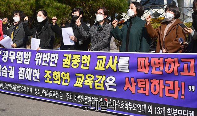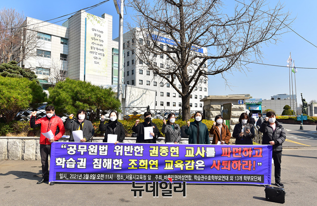 바른인권여성연합을 비롯한 13개 시민단체가 8일 오전 서울 종로구 서울시교육청 앞에서 기자회견을 열고 "부당한 압력으로 전교조 해직교사 복직 강요한 조희연 교육감은 사퇴하고, 복직교사를 즉각 파면하라"고 주장했다.시민단체는 "학교와 학교법인을 수년간 음해하고 학습권을 지키려는 학부모들을 고발하는 등 부적절한 행위로 해임된 전교조 교사의 파면"하고 "이 전교조 교사의 불법적인 복직을 위해 부당한 압력을 행사한 조희연 교육감의 사퇴를 촉구한다"고 말했다.