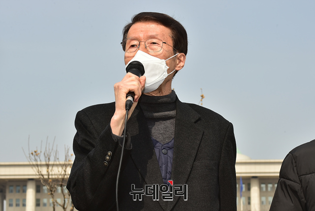 김태훈 한반도인권과통일을위한변호사모임(한변) 회장이 9일 오전 서울 여의도 국회 정문 앞에서 열린 '제101차 북한인권을 위한 화요집회'에 참석해 발언을 하고 있다.