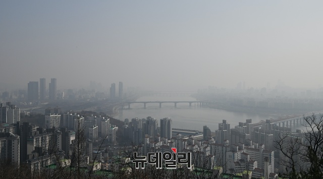 수도권 등 초미세먼지 농도가 '나쁨' 수준을 보이는 10일 오후 서울 중구 매봉산공원에서 바라본 도심이 뿌옇게 보이고 있다.