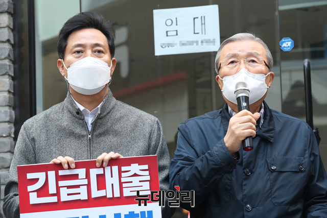 김종인 국민의힘 비상대책위원장이 10일 서울 중구 명동 상가 일대를 오세훈 서울시장 후보와 둘러 본 후 상인회 관계자들과 함께 간담회를 갖고 있다 (사진=국민의힘)