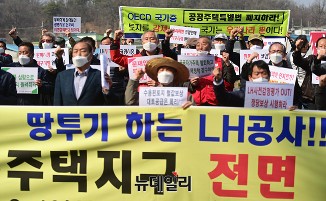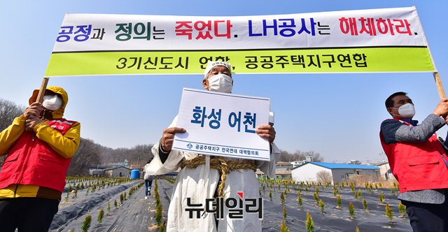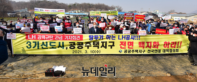 공공주택지구 전국연대대책협의회 회원들이 10일 오후 한국토지주택공사(LH) 투기 의혹이 불거지고 있는 경기 시흥시 과림동 현장을 찾아 '3기 신도시 공공주택지구 전면 백지화'를 촉구하는 기자회견을 갖고 있다.