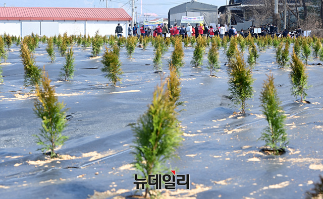 한국토지주택공사(LH) 투기 의혹이 불거지고 있는 경기 시흥시 과림동 현장에 심겨 있는 묘목. 공공주택지구 전국연대대책협의회 회원들이 10일 오후 과림동 현장에서 기자회견을 열고 '3기 신도시 공공주택지구 전면 백지화'를 촉구했다.