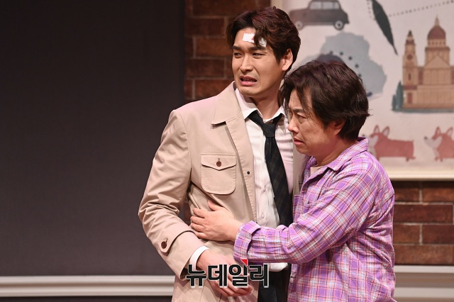배우 서현철, 이한위, 정겨운이 9일 오후 서울 강남구 백암아트홀에서 열린 연극 '스페셜 라이어' 프레스콜에서 하이라이트 장면을 시연하고 있다.