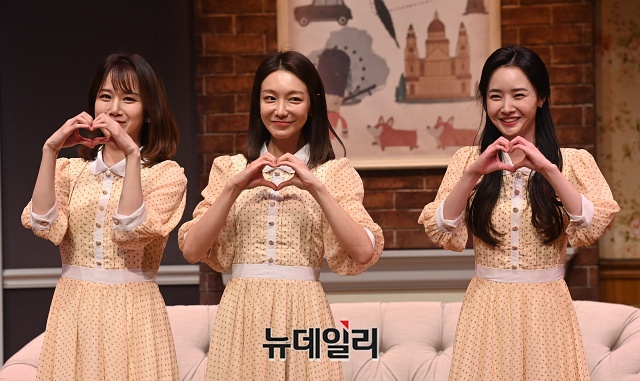 배우 오세미, 신소율, 배우희가 9일 오후 서울 강남구 백암아트홀에서 열린 연극 '스페셜 라이어' 프레스콜에서 포토타임을 갖고 있다.