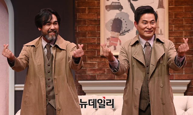 배우 이한위, 김원식이 9일 오후 서울 강남구 백암아트홀에서 열린 연극 '스페셜 라이어' 프레스콜에서 포토타임을 갖고 있다.