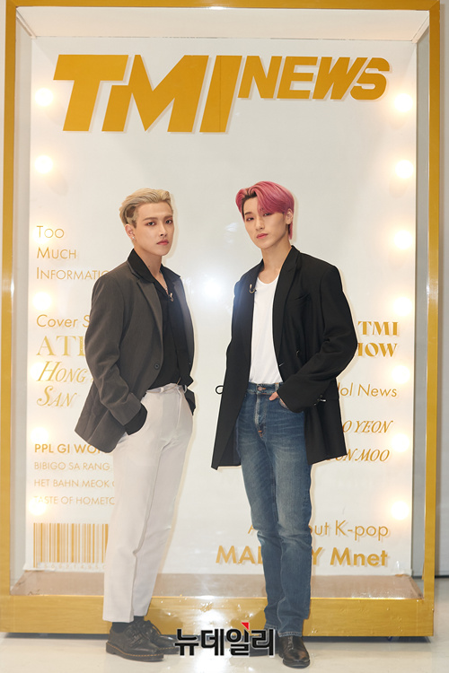 에이티즈 멤버 홍중과 산이 10일 오후 온라인으로 열린 엠넷 예능 'TMI NEWS(연출 권영찬, 황성호)' 제작보고회에서 포토타임을 갖고 있다.